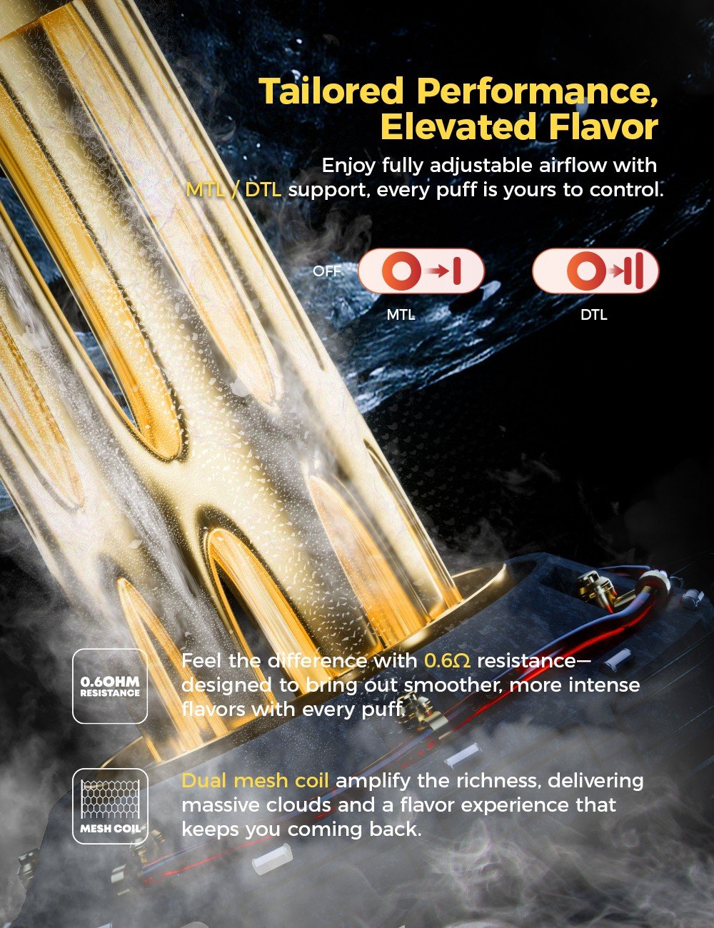 Átlátszó 22ML tartály. Dupla hálós tekercs. Erőre és maximális élvezetre tervezve. 0.6Ω hálós tekercs extra sűrű gőz és új szintű ízélmény érdekében.